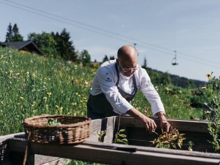 Den ganzen Tag können sich die Gäste an der Teebar und am Obstkorb bedienen und so viel frisches Quellwassertrinken wie sie möchten. „Alle gesunden Sachen sind bei uns selbstverständlich in der 3/4 BIO-Vitalpension enthalten“, so Sieglinde Kessler. Wenn die Seniorchefin nicht gerade in ihrem Büro arbeitet, kümmert sie sich persönlich um den hoteleigenen Garten, in dem Blumen und Kräuter wie in einem traditionellen Bauerngarten zusammen wachsen und gedeihen und ist insgesamt für das geschmackvolle Ambiente zuständig. Angebaut wird hier natürlich im Biodynamischen Stil mit eigenem Dünger und Wiederverwertung der Reste.