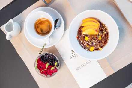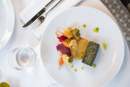 Das hauseigene Restaurant serviert ein vollständig veganes Menü mit einem zeitgemäßen kulinarischen Ansatz, der sich auf Saisonprodukte, hausgemachte Zubereitungen (Fermentationen, frische Pasta, Tofu, Tempeh) und raffiniertes Gebäck konzentriert.