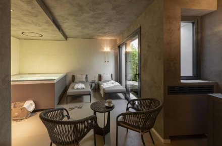 Three suites offer private terraces with outdoor jacuzzis and views over the village or the lake.