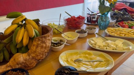 A breakfast buffet in the morning with fresh fruit, muesli, Greek yoghurt, various cheeses, jams, teas, coffee, milk and juices.